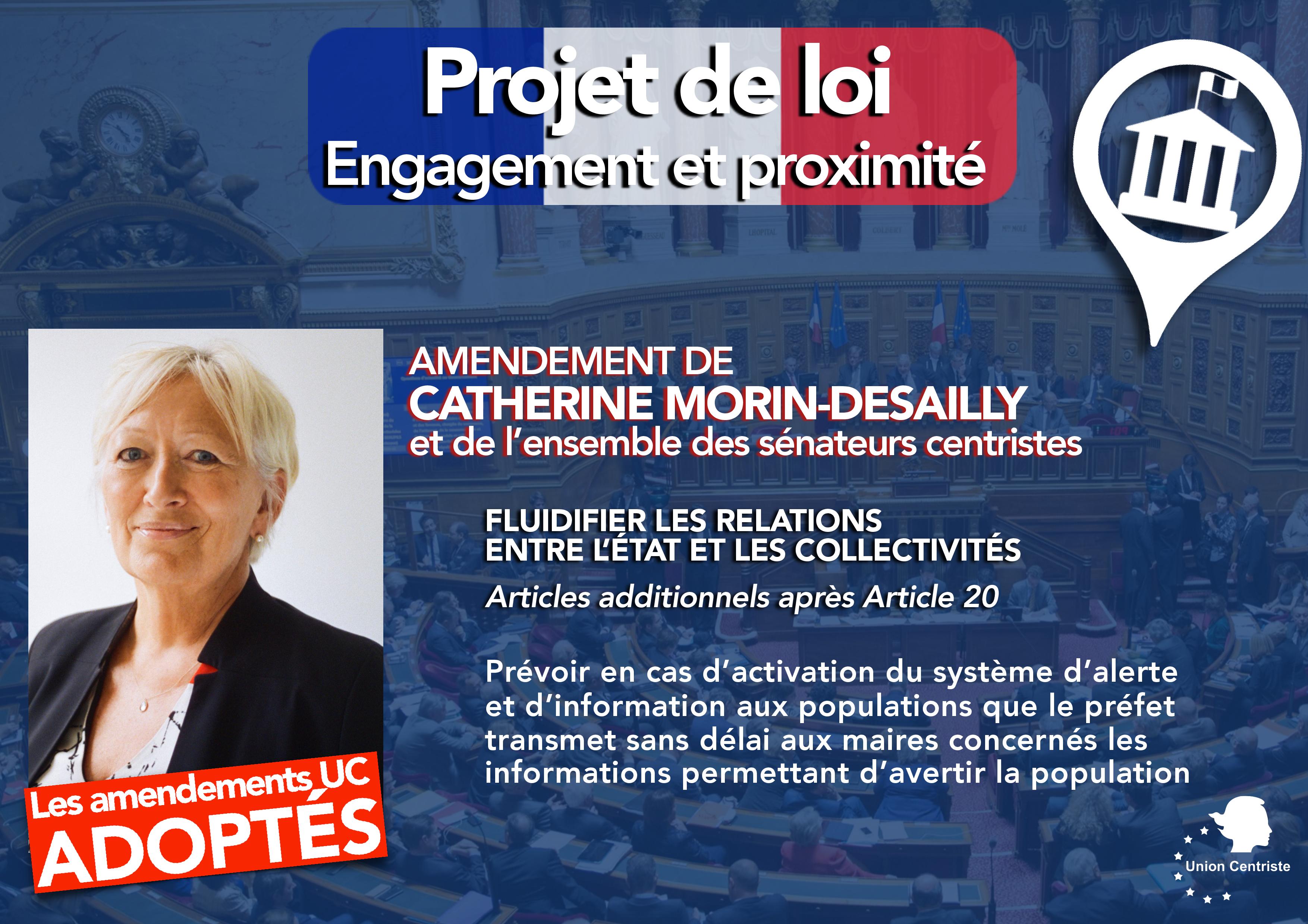 L’Assemblée nationale a adopté, le 21 novembre 2019, un amendement du Gouvernement complétant celui déposé par Catherine MORIN- DESAILLY, sénatrice de la Seine-Maritime (Union Centriste), et adopté à l’unanimité au Sénat, visant à améliorer l’information des maires en temps de crise dans le cadre du projet de loi relatif à l’engagement dans la vie locale et à la proximité de l’action publique.